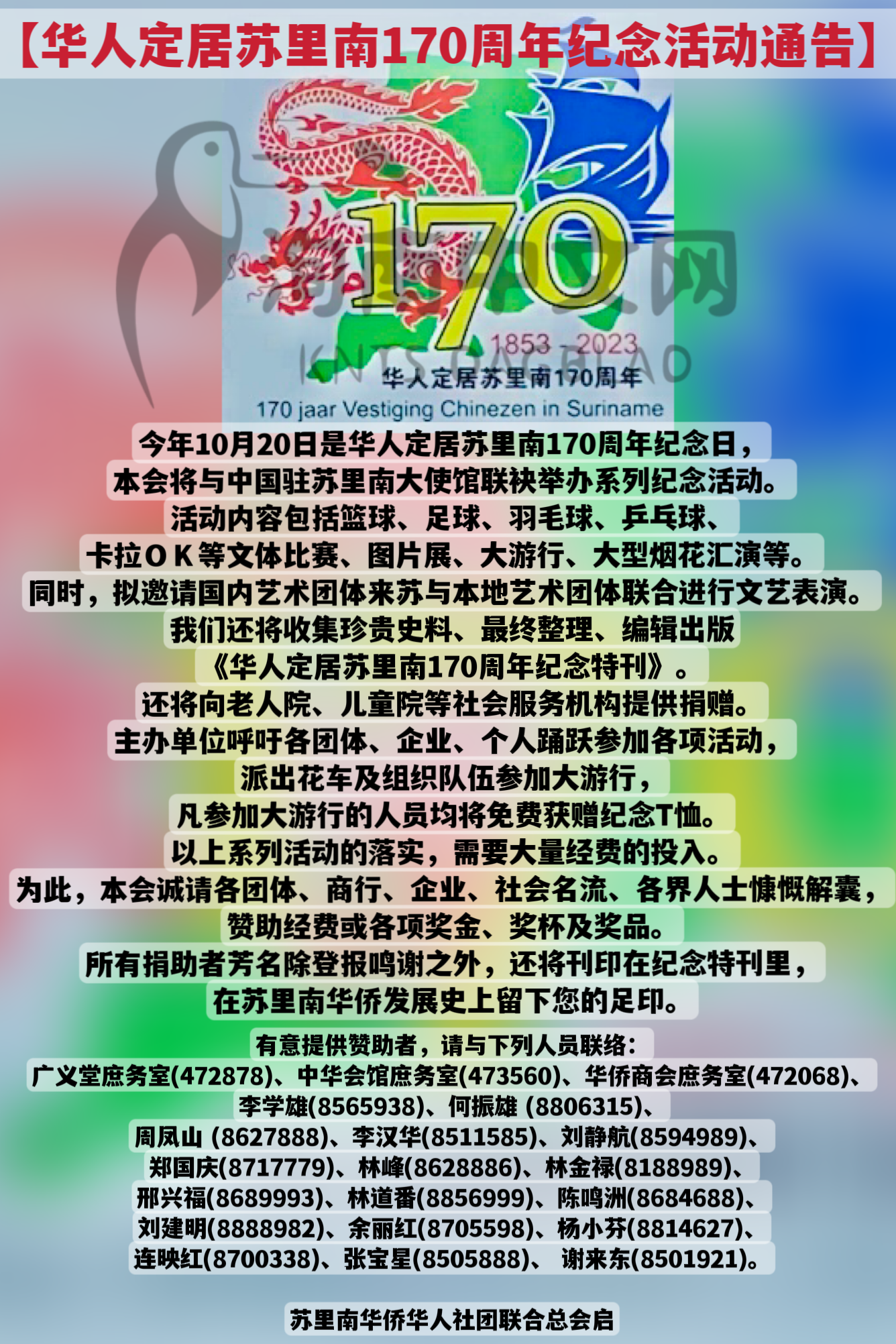 以上系列活动的落实,需要大量经费的投入。为此,本会诚请各团体、商行、企业、社会名流、各界人士慷慨解囊,赞助经费或各项奖金、奖杯及奖品。所有捐助者芳名除登报鸣谢之外,还将刊印在纪念特刊里,在苏里南华侨发展史上留下您的足印。