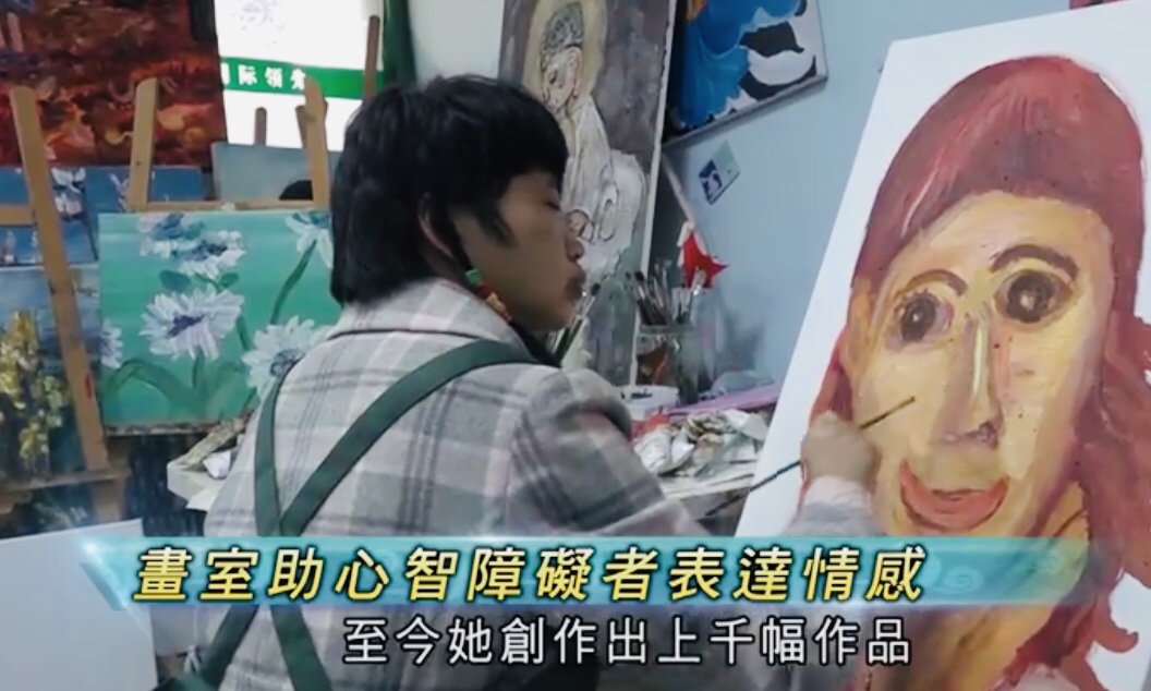 创办这间画室的徐渝江,女儿谢昕欣出生时不幸患上脑瘫,但从小便展露出绘画的天赋,画画成为她与外界交流的方式。徐渝江因此与一家公益机构创办了画室,帮助上百名心智障碍者透过绘画进行康复训练。