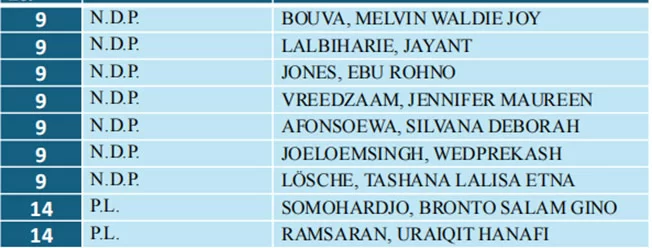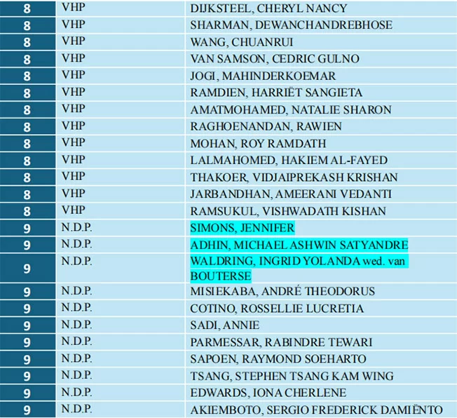 NDP方面亦有类似情况。Ingrid Bouterse-Waldring凭优先票进入国会,而原列名单第十九位的Claudie Sabajo则暂未取得席位。惟若党主席Jennifer Simons竞逐总统之职,Sabajo将可递补其位,步入议会。