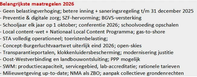 在医疗方面,重点推进预防与基层医疗,发展电子病历和远程医疗,改革国家健康基金(SZF),加强药品供应(BGVS),关注精神健康、母婴保健和危机应对。Albina、Wanica 与 Atjoni 医院将逐步投入使用,并提高医护待遇。
