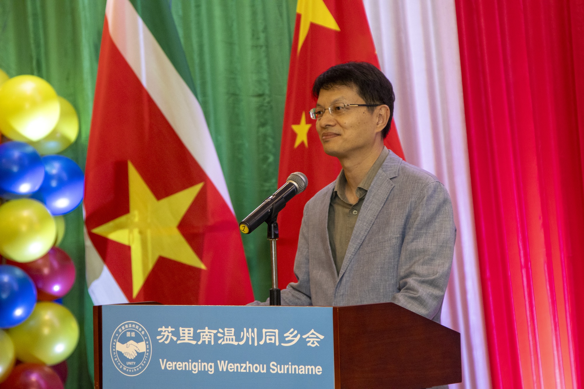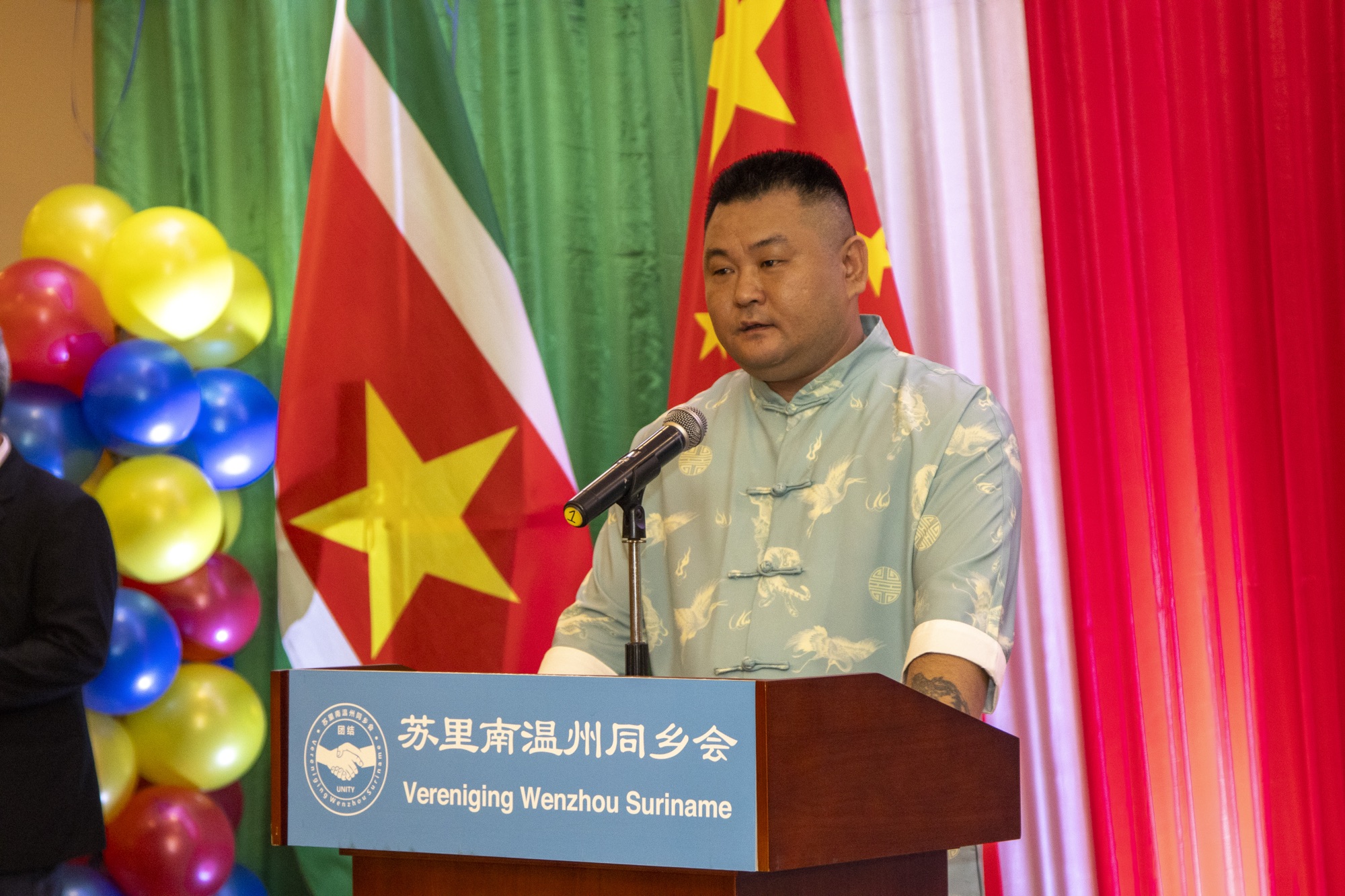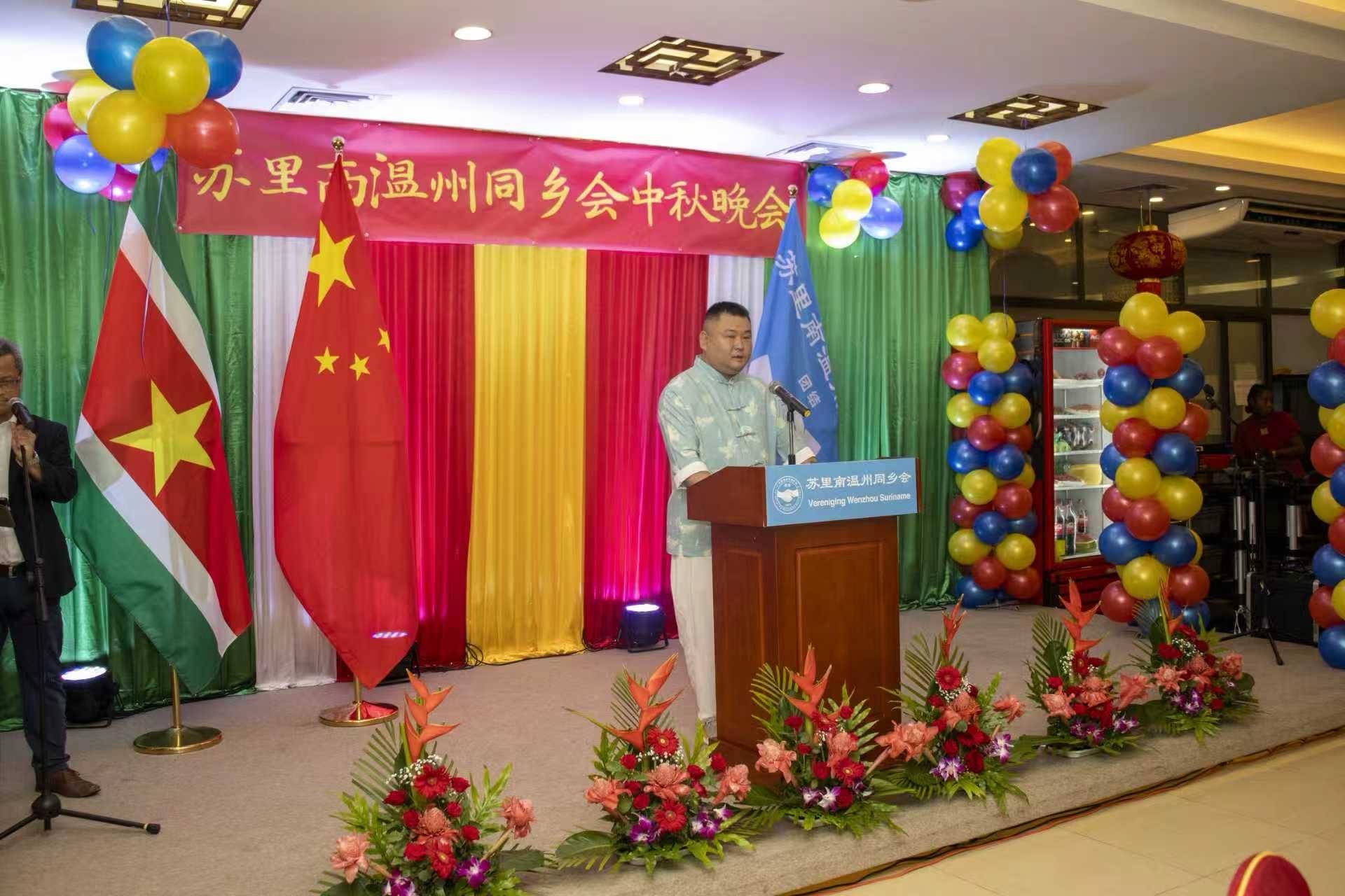 温州同乡会会长胡志定向来宾们表示感谢,并致以节日问候和祝愿。他表示,中秋节是团圆节,温州同乡会是所有乡亲们的家,在这里我们可以找到家的温暖和幸福。胡会长为温州人敢闯,吃苦耐劳和团结一致的精神感到自豪,为温州侨胞为苏里南所做的贡献感到骄傲。表示同乡会将继续发挥连接侨民的桥梁纽带作用,继续支持祖国家乡的建设,为加深中苏发展和友谊贡献力量。