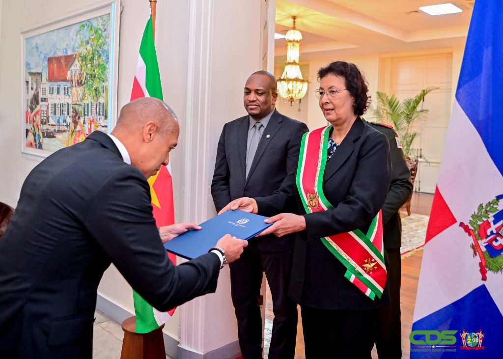 在正式递交国书后,比利时大使艾伦·德赫斯特(Ellen de Geest)、多米尼加大使埃内斯托·托雷斯·佩雷拉(Ernesto Torres Pereyra)及欧盟代表卢卡·皮耶兰托尼(Luca Pierantoni)分别与苏里南国家元首举行会谈。比苏双方确认将深化教育学术合作与旅游交流,德赫斯特大使强调比利时对苏里南的持续承诺。多米尼加大使托雷斯·佩雷拉指出两国在旅游、农业、教育领域的合作潜力,宣布将推动建立直航通道促进人员往来与投资贸易,同时明确”项目运营应以苏里南公民为主体,外籍人员仅临时补充技术缺口”。