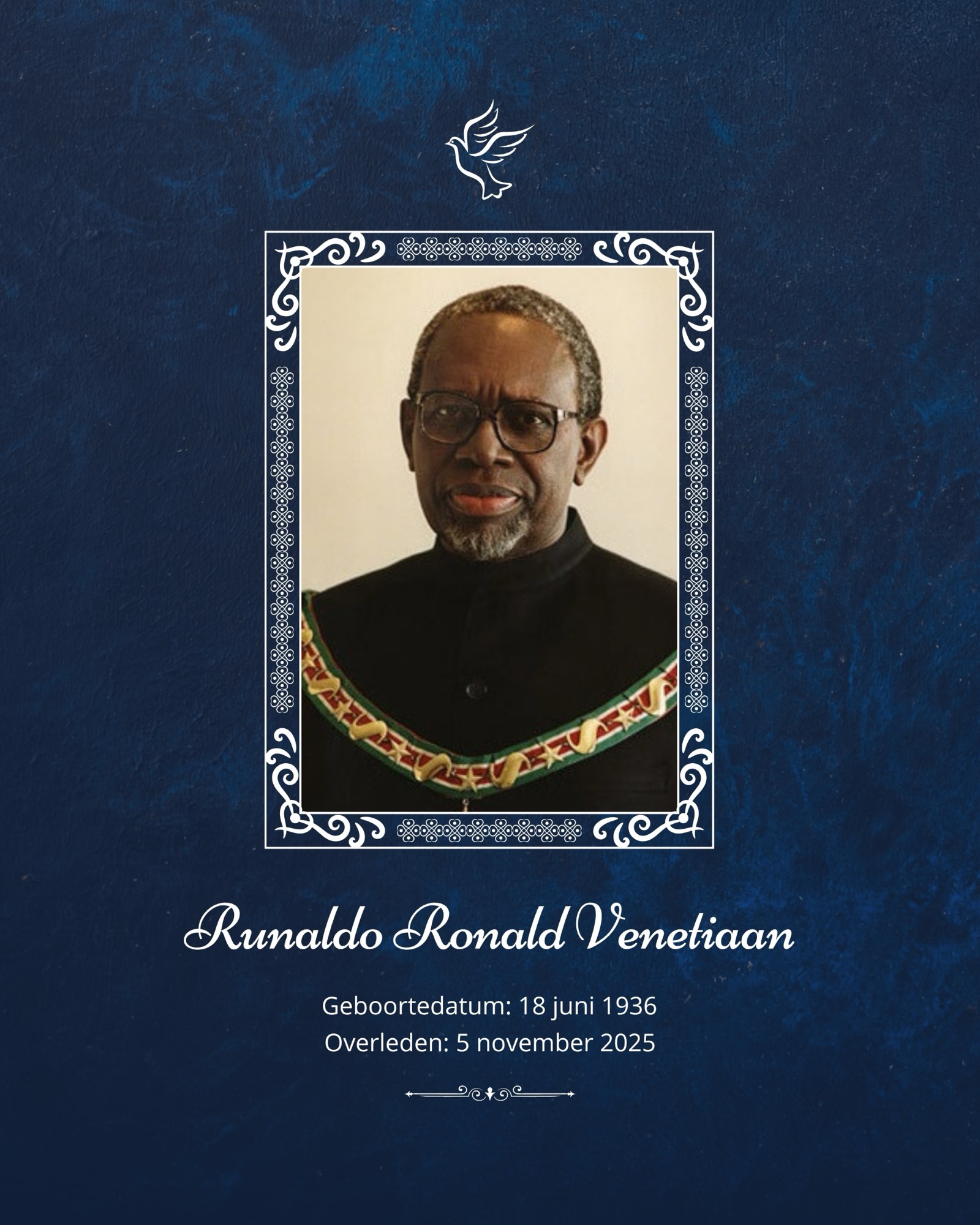 《政府网讯》前总统Runaldo Ronald Venetiaan与世长辞,享年89岁。2025年11月5日周三的逝世对苏里南构成重大损失。这位前国家元首曾于1991-1996年及2000-2010年期间三度担任总统。1969年他曾担任Algemene Middelbare School高中校长。
