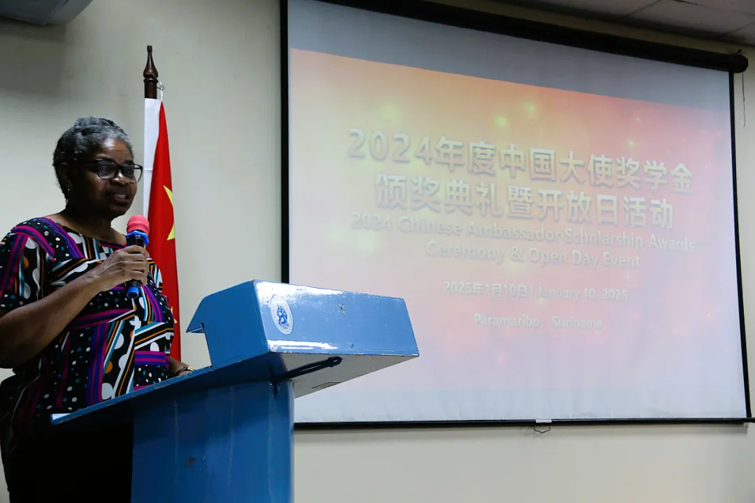 Shanti Venetiaan女士在致辞中指出,这是中国驻苏里南大使馆第一次面向苏里南大学学生设立奖学金,对苏里南大学学生的专业学习与汉语学习有非常重要的激励作用。该奖学金是对学生在学术和汉语学习方面努力的肯定,也希望通过这一奖学金,鼓励更多学生学习中文,开拓未来机遇。Shanti校长祝贺首批获奖学生取得的成就,并感谢中国驻苏里南大使馆一直以来的支持。