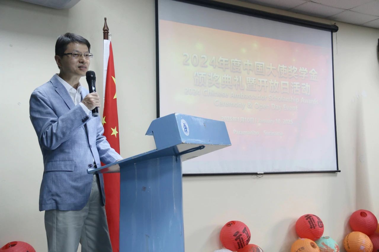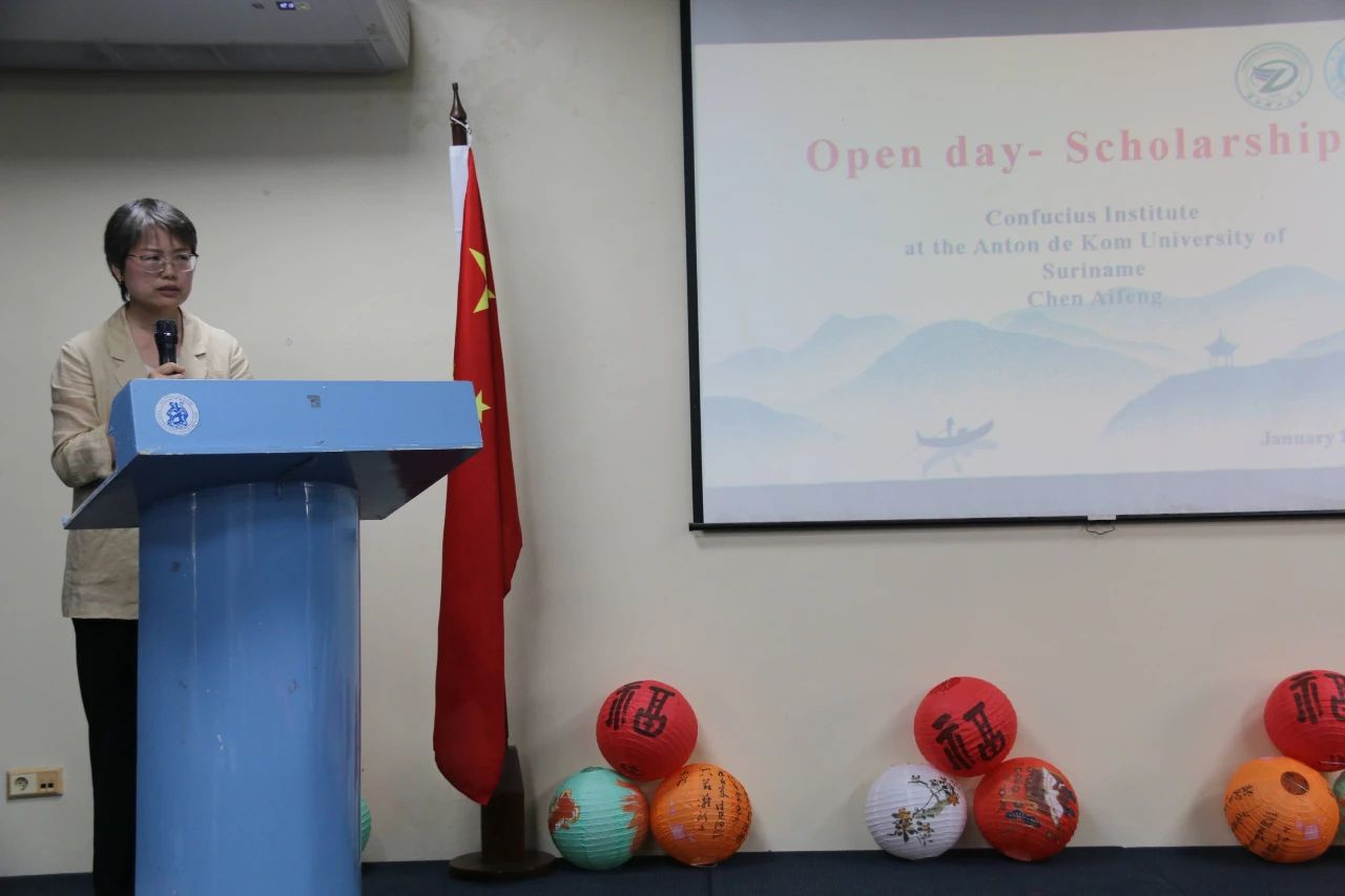 2025年1月10日下午2时,“中国大使奖学金”颁奖典礼和苏里南大学孔子学院开放日活动在University Guesthouse conference room成功举办。中国驻苏里南大使林棘、参赞刘振华、苏大校长及孔院理事会主席Shanti Venetiaan及孔院理事会副主席Gardel Jong-A-Ten、孔院中外方院长、全体教师、苏大学生及社会人士、媒体记者等出席了活动现场。