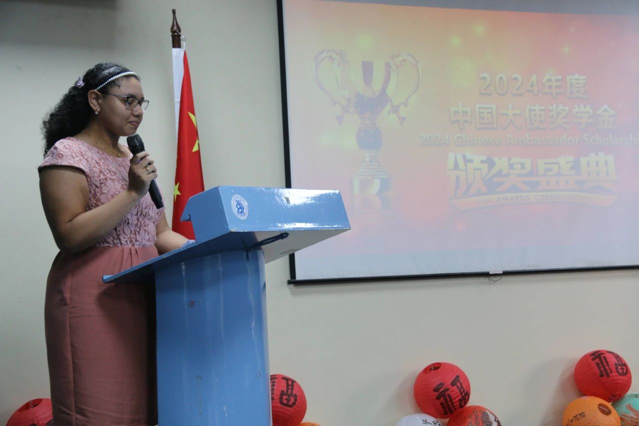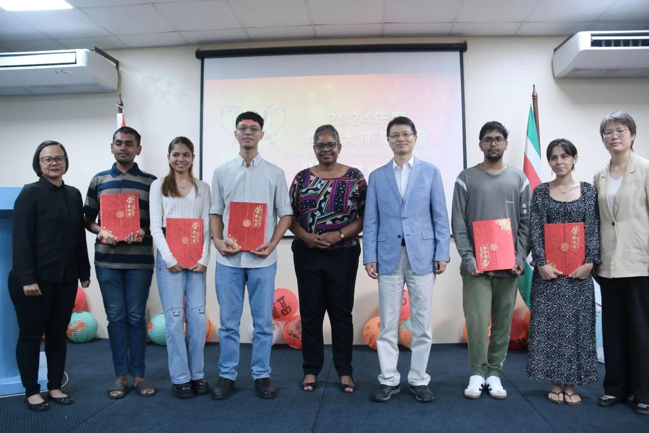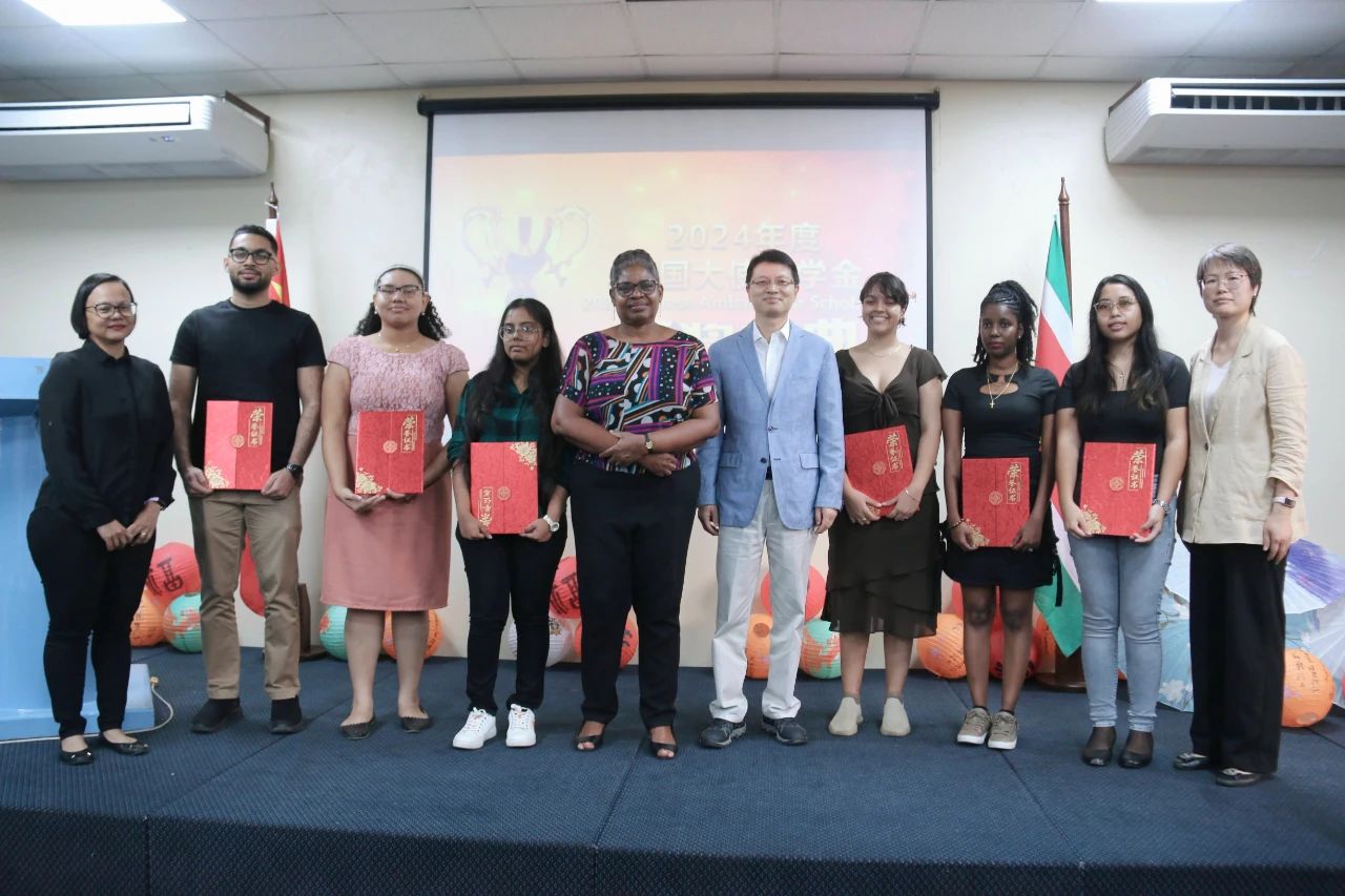 本次共有13名苏里南大学学生荣获“中国大使奖学金”。林棘大使为获奖学生颁发证书,表达了对他们的殷切期望。两位获奖学生代表在发言中分享了他们的学习经历和获奖感言,对中国大使馆的鼓励表示感谢。