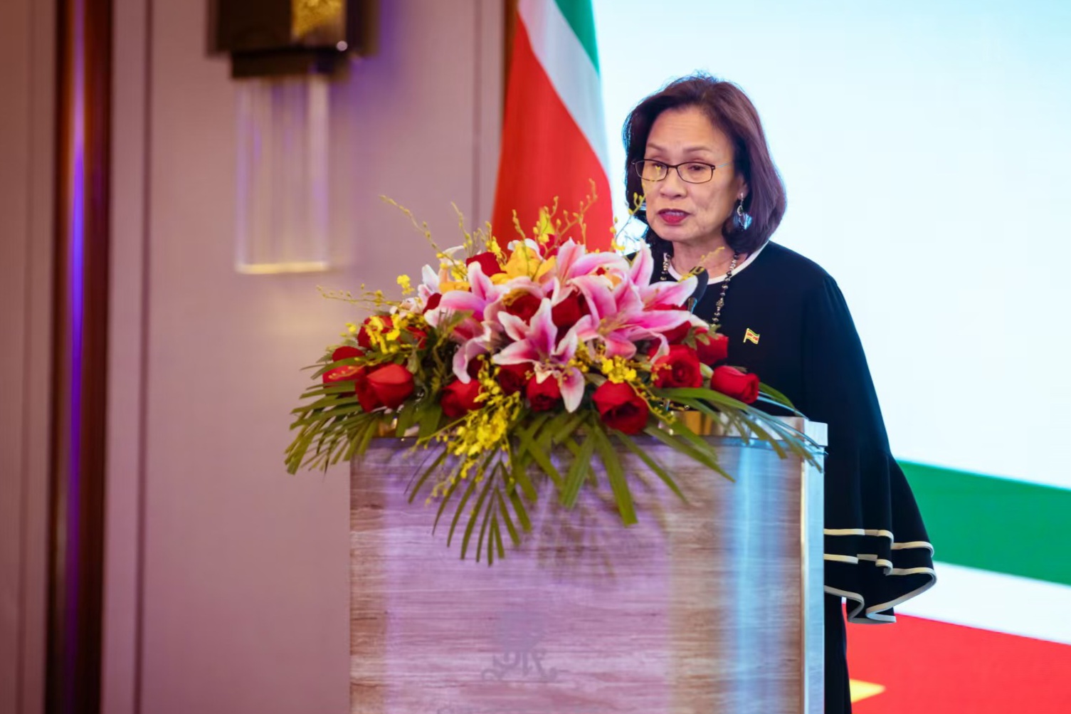 苏里南大使张碧芬在讲话中强调了苏里南政府对未来的愿景。她指出可持续发展、经济增长和社会公正是国家政策的核心支柱。此外,她还强调了苏里南与中国之间紧密关系的重要性,特别是在贸易、基础设施和文化交流方面的合作。