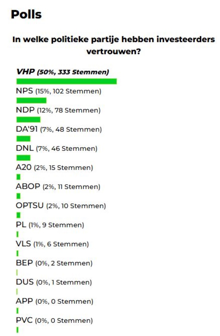 此次民调由《苏里南日报》面向读者开展,反映了投资者对各政党的信任度。结果显示,VHP目前最受投资者青睐,这与其稳定经济政策有关。
