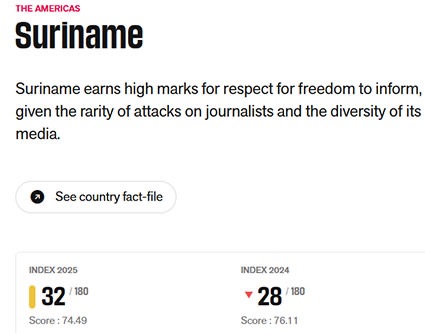《星网讯》在国际记者组织“无国界记者”(Reporters Without Borders,RSF)最新发布的2025年世界新闻自由指数中,苏里南的排名从去年的第28位下滑至第32位,总评分由76.11降至74.49。尽管如此,该国仍位列“合理至可接受新闻自由”国家之列。