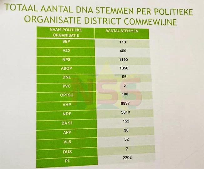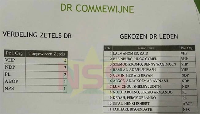 Commewijne选区的选举委员会于6月4日下午已举行选举结果公布会议。在14个参选政党中,除VHP之外,NDP、PL、ABOP、NPS也分别在地方议会和区议会层级赢得席位。