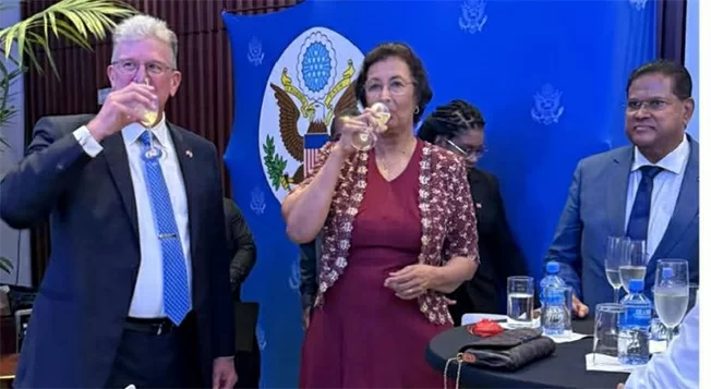《星网讯》美国驻苏里南大使馆于7月3日隆重举办美国独立249周年纪念活动,总统单多吉与候任总统西蒙斯共同出席。双方在活动中重申两国基于自由、民主价值的紧密伙伴关系。