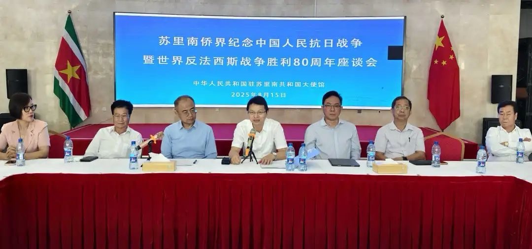 2025年8月15日,驻苏里南使馆举办苏侨界纪念中国人民抗日战争暨世界反法西斯战争胜利80周年座谈会,驻苏大使林棘出席并致辞,旅苏侨团、中资企业、苏大孔院代表等约30人参加。