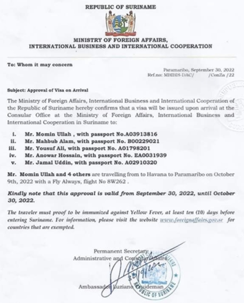 Fly Allways 航空公司的总经理说,根本没有这些人在航班上,没有那些人姓名和护照号码。 他不知道存在有这封信,再说,信上的航班号码也是错的。外交部也不知道有这一封信。单多吉总统表示,按照约定,那些人员经过筛选后,将会在国际移民组织的协调下安置好。在这些人来苏里南之前,官方需要先与各相关方商量。