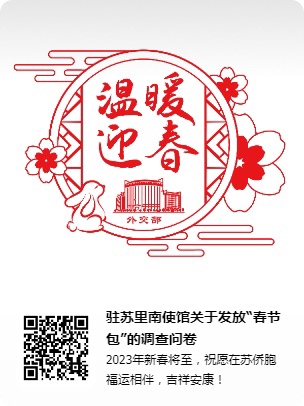 岁序常易,华章日新。兔年春节将至,党和政府时刻牵挂着海外中国公民的健康和福祉,为帮助旅苏侨胞度过一个平安、健康、祥和的春节,驻苏里南使馆将开展“温暖迎春”活动,向生活确有困难的侨胞发放慰侨物资“春节包”。