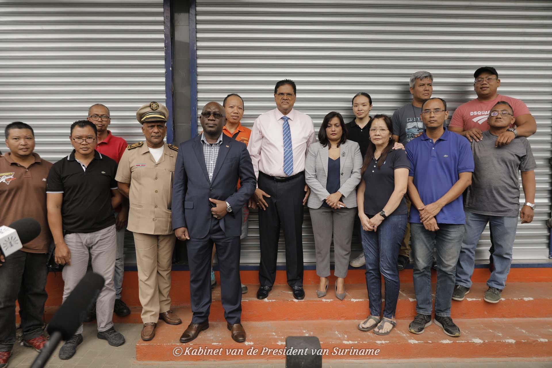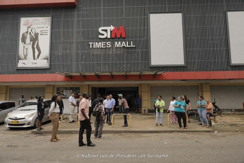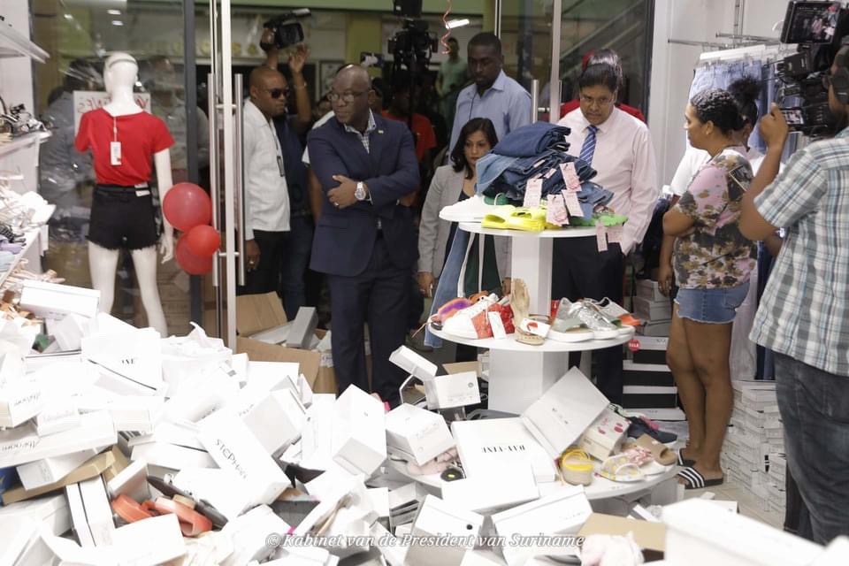 总统和部长们视察了帕拉马里博市中心的一些零售商店,包括:Rudisa、Eurosil、Times Mall、All Star、Afang Gifts & More、Shell Maagdenstraat,这些都是遭受巨大损失的商户。Cheungs Sound & Visions 乐器商店几乎被抢劫一空。 这些商户现在都面对巨大的困难和损失,现在还需要额外支出来清理和加强商店。这些商户在未来两周到两个月内没有收入,并且必须继续支付员工工资。政府和企业家都不能阻碍和平示威的权利,但坚决反对破坏和抢劫。