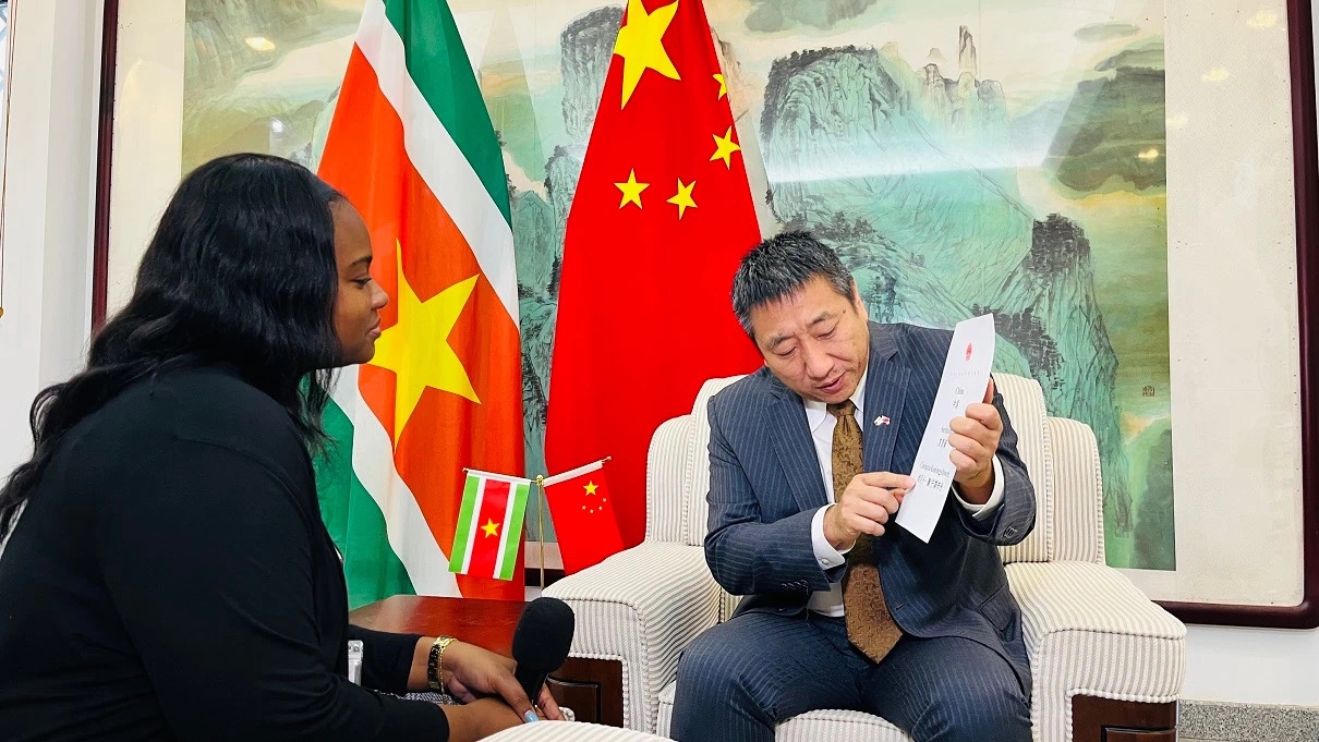 中国驻苏里南大使馆-4月20日是联合国中文日,中国驻苏里南大使韩镜就此接受苏国家电视台STVS晚间新闻栏目专访。