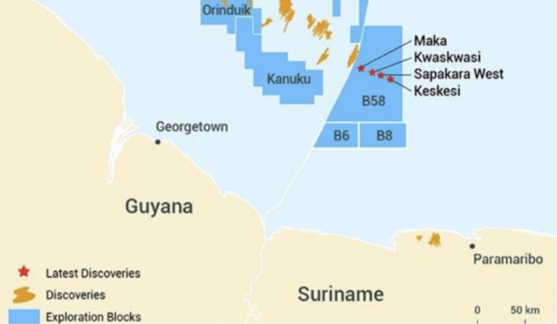 浅水区块第 6 和 第 8 海区紧邻第 58 海区。它们位于苏里南海岸的南部,靠近圭亚那边境,水深在30米到50米之间。