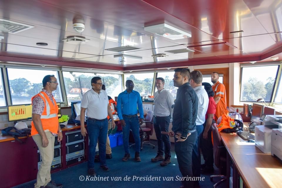 2022年苏里南河流疏浚项目(SRDP 2022)的实施正在稳步推进。目前正在进行项目第二阶段的最后工作。6 月 27 日(星期二),总统 Chandrikapersad Santokhi 率领的代表团参观了 De Boer-Boskalis 疏浚施工船。船上的专家解释了疏浚是如何进行的、砂子倾倒在哪里,以及监测如何进行的。该疏浚项目是 Hakrinbank、苏里南海事局 (MAS) ,以及公共工程部 (OW) 和交通、通讯和旅游部 (TCT) 之间的公私合作项目。