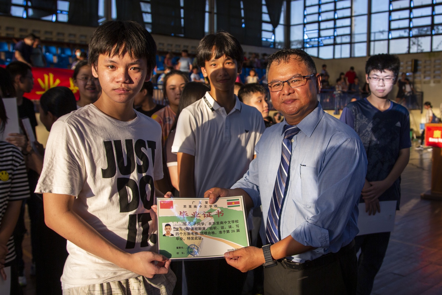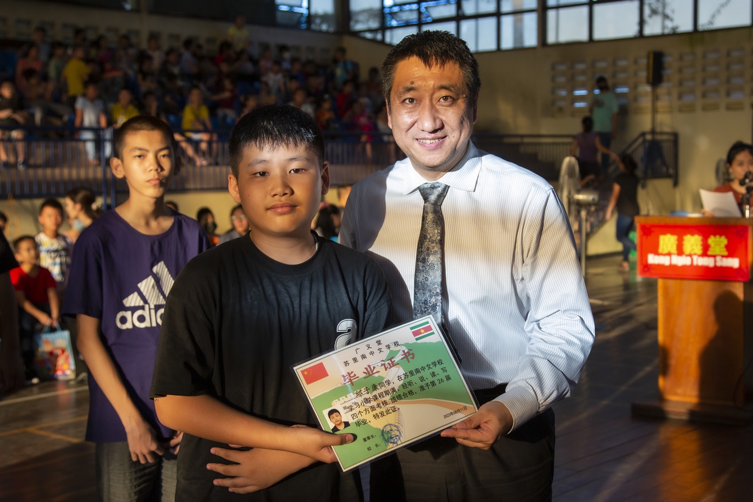陈舜军校长代表中文学校向毕业生表达了祝福,向全体老师和所有促成毕业生完成学业的各个单位和各方人士表示感谢。他特别提到中国大使馆、苏里南大学、孔子学院和循义公司。