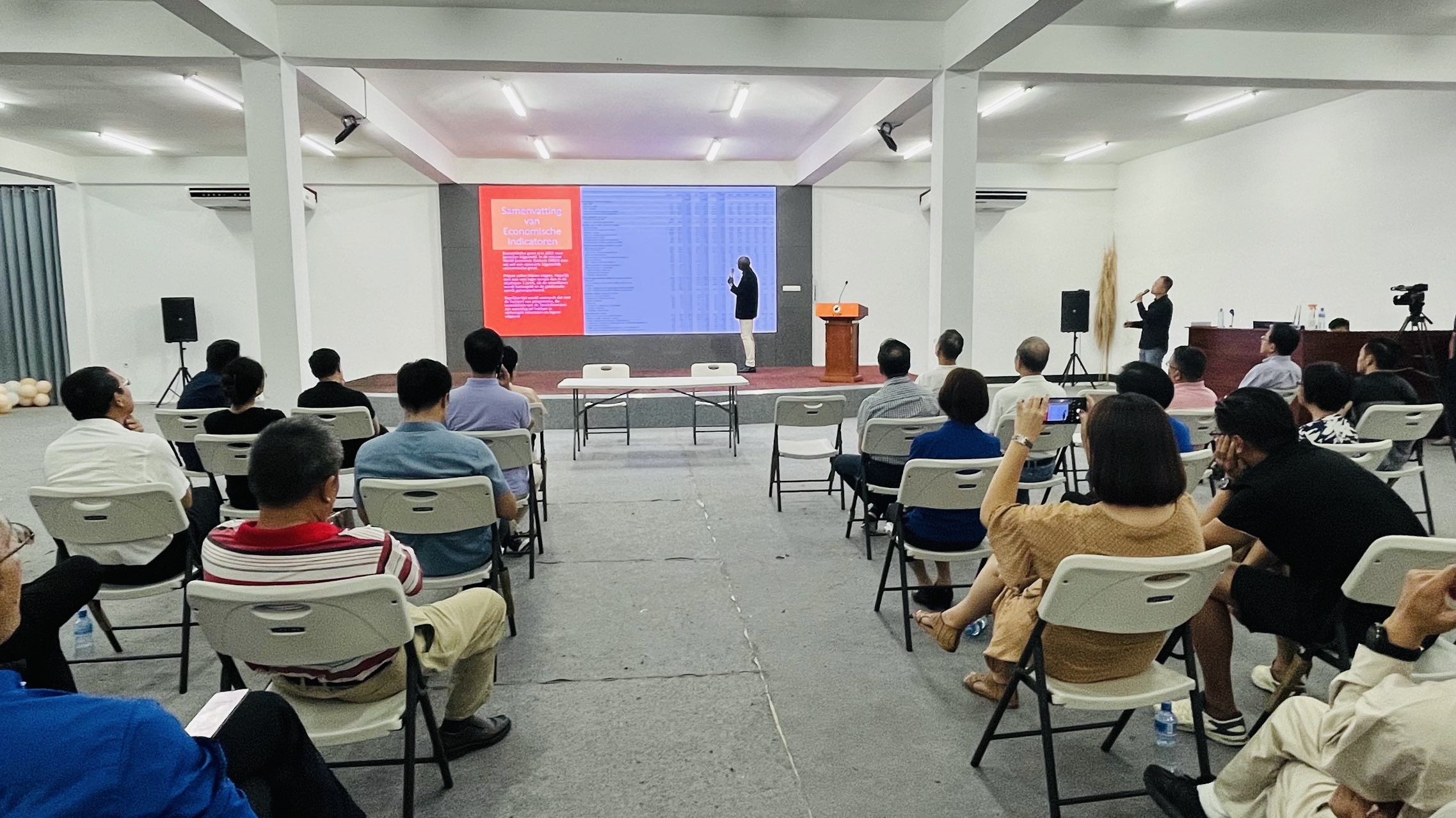 Eckhorst以苏里南多年来的经济数据为依据向与会者进行了阐述与说明。他指出,苏里南在费内希安政府时期,在人均收入方面已经达到了中等偏高国家水平,但是到了2010至2020年期间执政的政府那里,他们没有采取应有的政策保住这种收入能力,反而大量消费。从2014之后,本国的经济基本上没有回到原来有过的繁荣。尽管如此,政府仍然没有减少开支,继续过“最富有时代的生活“。收入没有增长,支出却持续增加,结果使国家陷入庞大的债务中。这些债务是还的,是要付利息的。这就导致了过去多年来汇率的持续上涨。