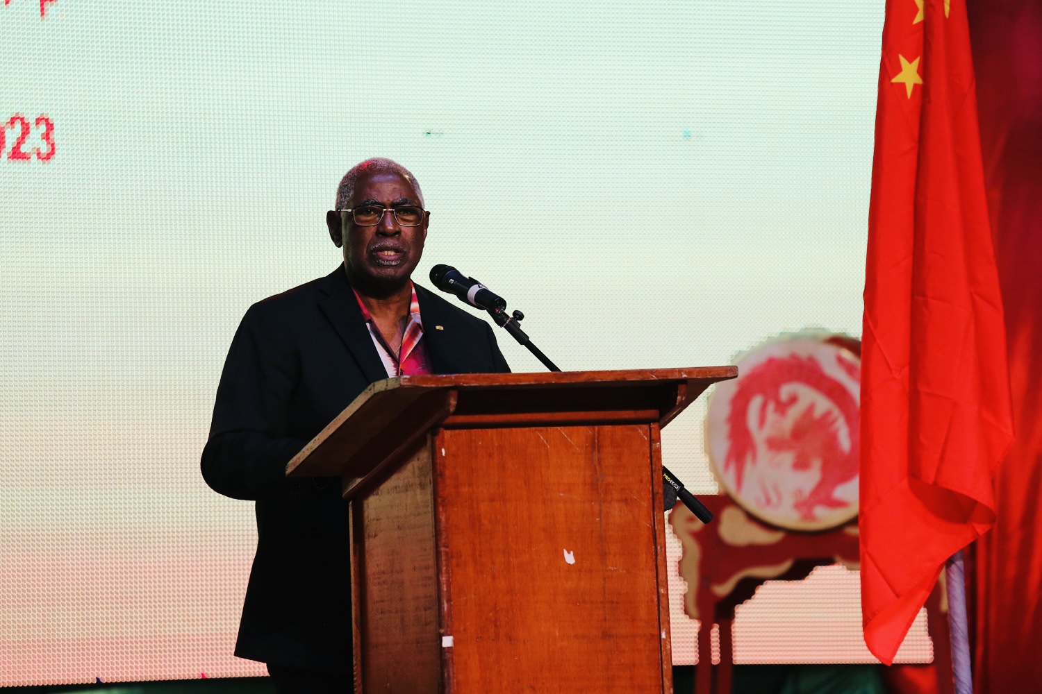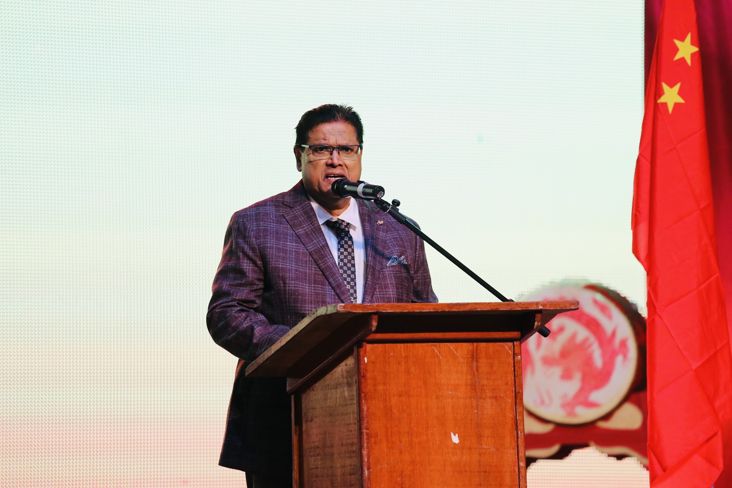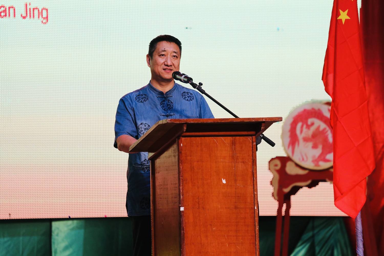 韩镜大使首先分享了下午和侨胞步行五公里进行花车巡游的喜悦和兴奋。他代表大使馆对华人定居170周年表示了热烈的祝贺。他指出中华璀璨的历史文化和思想推动了中外文明交流互建,促进了人类文明进步。他回顾了170年前华人定居的历史,充分肯定了前辈们的努力付出以及现代华人对苏里南社会的贡献和取得的地位。他盛赞旅苏华人自强不息,奋斗、包容的精神为中华民族现代文明增添了光彩。他还肯定了系列纪念活动在苏里南社会中的积极影响。最后他预祝晚会取得圆满成功。