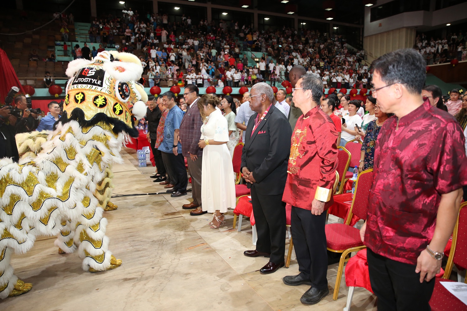 苏里南共和国总统单多吉及第一夫人,中国驻苏里南大使韩镜莅临晚会。苏里南国家禧年委员会主席、华人议员、多位政府部长、多国使节、苏华总会各侨团领导、中资企业代表以及多位社会名流等嘉宾,云集会场,三千多侨胞和其他族裔民众踊跃参加,场面喜庆热闹。