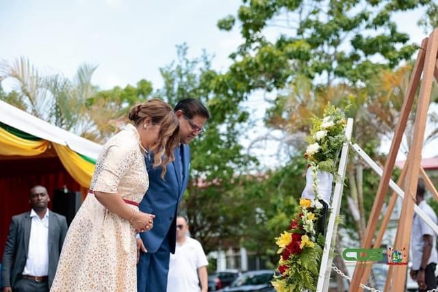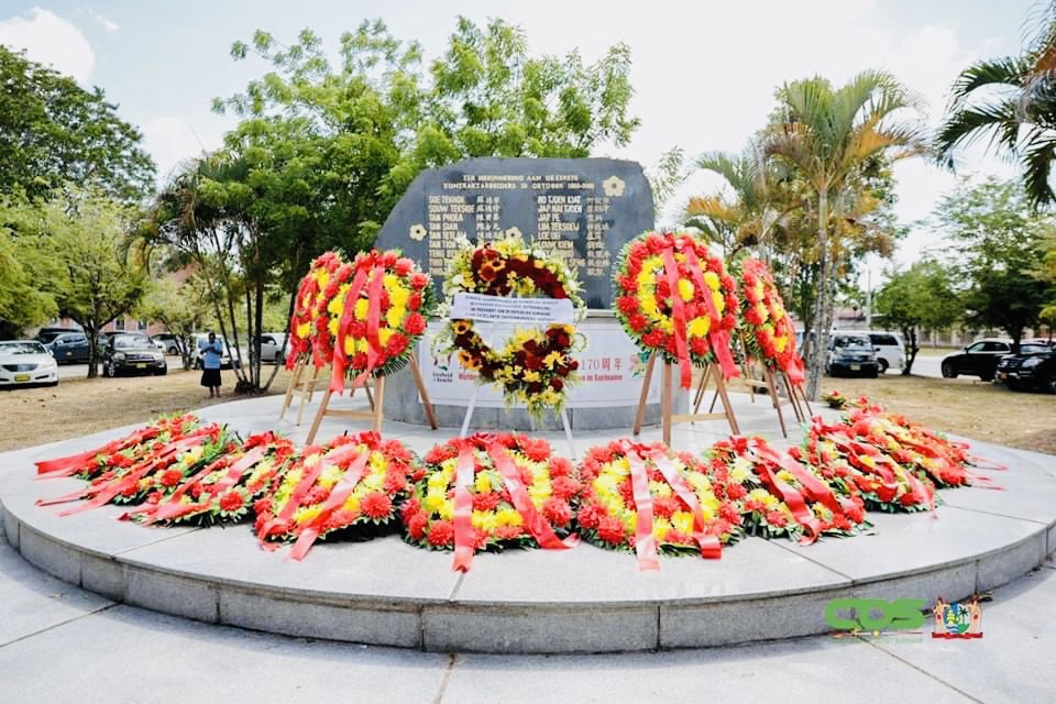 (苏里南大学孔子学院何世坤供稿) 2023年10月20日上午,帕拉马里博风轻云净,碧空如洗。苏华总会在友谊公园隆重举行华人定居苏里南170周年纪念活动。苏里南总统单多吉、中国国务院侨务办公室主任陈旭、中国驻苏里南大使韩镜、国家禧年纪念委员会主席Jack Uden、苏华总会会长李学雄、国会议员、侨领及各界人士出席了活动,并向首批华人抵苏纪念碑敬献花环。