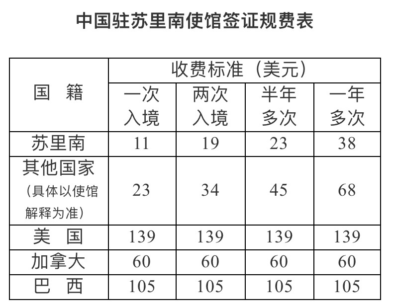 为便利中外人员往来,自2023年12月11日至2024年12月31日,中国驻苏里南大使馆对赴华签证规费进行调减。调减后的签证规费表如下: