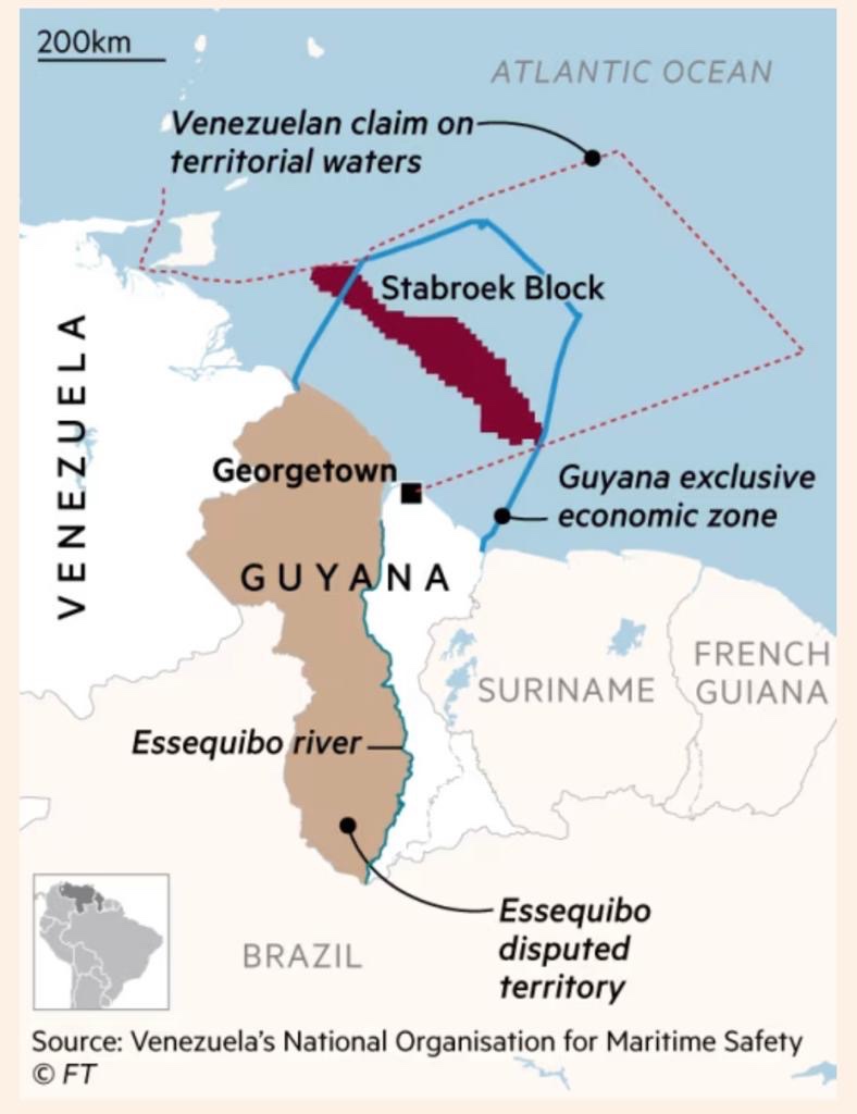 委内瑞拉宣称有主权的领海包括向圭亚那方向延伸的200海里,含盖了圭亚那主要的海洋油田Starbroek海域,以及苏里南第58海区,也就是至今勘探发现的含有石油最丰富的海域。