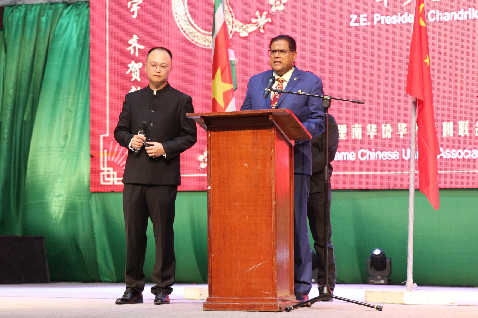 单多吉总统在致辞中表示,对于苏里南来说,龙年来得正是时候,因为政府将会利用龙年象征的力量和勇气让国家摆脱金融危机,并完成国家经济改革的使命。单多吉总统称龙是力量、进步、勇气和繁荣的象征。作为一个国家,无论种族和出身,我们都需要龙年提供的寓意向前迈进。苏里南华人社团是促进人民团结的重要一部分,在龙年当中,华人兄弟姐妹要迎难而上,在国家发展的道路上勇往直前,共同努力,共创美好未来。170年来,华人为苏里南的发展作出了重大贡献。尤其是在创业方面,尽管是在偏远的本国内地他们同样也是如此。对于本国的华人社团,总统也认为他们很好地保存了自己的文化、传统、语言以及从中国带来的一切。在此基础上,苏里南种族的民众也能够享受完整独特的中国文化。单多吉总统呼吁进一步加强苏里南和中国之间的关系,并一起致力于实现进一步的经济增长。最后单多吉总统祝福社会各界特别是华人社团过一个繁荣、健康、幸福的新春佳节。