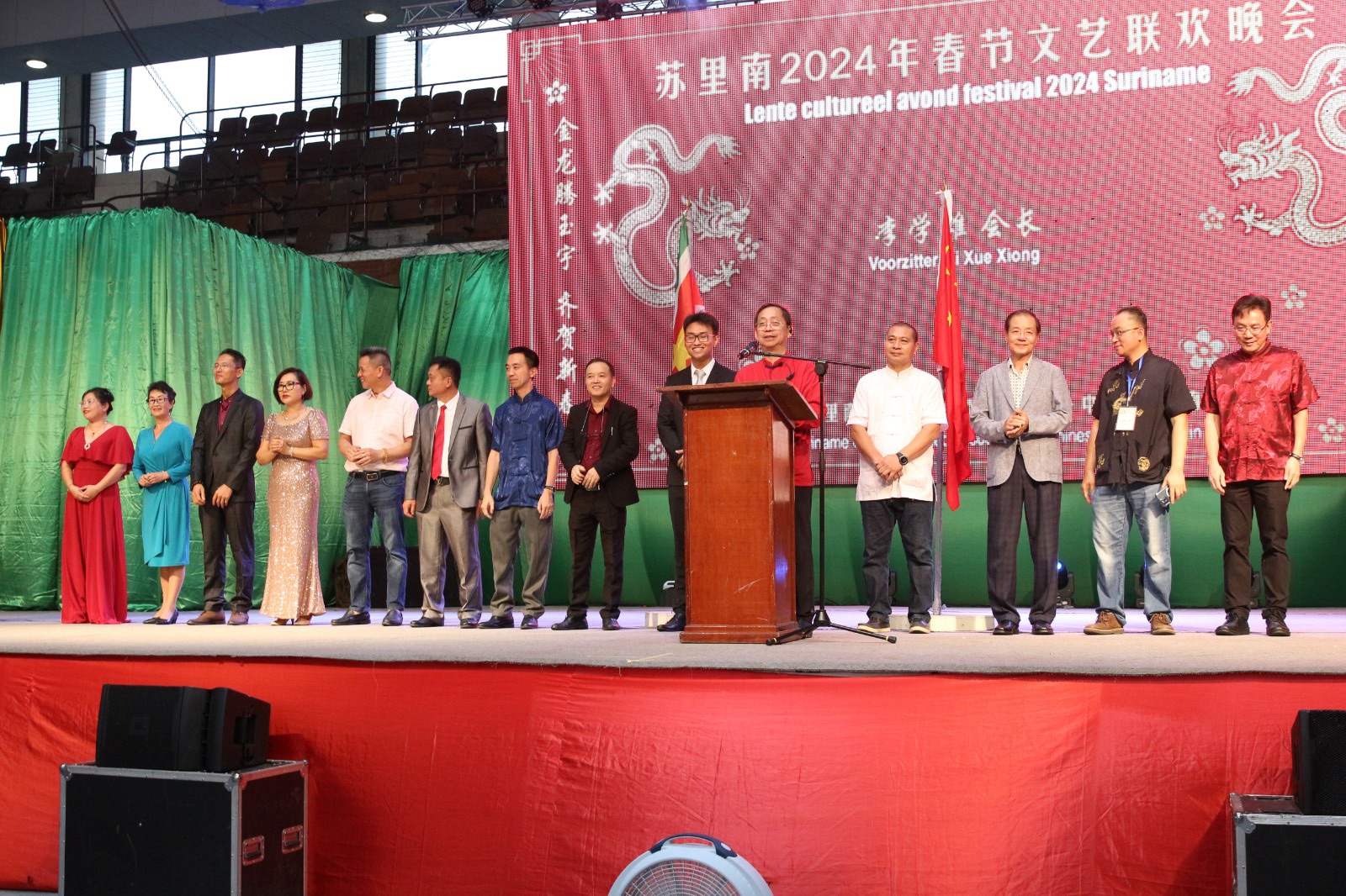 苏华总会会长李学雄首先致辞,向各位莅临现场嘉宾表示热烈欢迎和衷心感谢!他表示春节是中华民族最重要的传统节日。自从苏里南政府将中国春节定为全国法定节日以来,苏华总会每年都与中国大使馆联合举办春节庙会。今年是第八届春节庙会,同时也是首次在安东尼体育场举办的庙会。在苏里南,春节庙会已经成为展示中国文化的盛会,深受华侨华人和各族民众的欢迎。李会长表示本届庙会得到中国大使馆的大力支持,许多企业为活动提供赞助,大批台前幕后工作人员和演员为晚会的举办辛劳付出。为此,他代表苏华总会向所有向本次活动作出贡献的单位和个人表示衷心感谢!最后,李会长邀请苏华总会旗下13个侨团会长或代表上台向大家拜年。