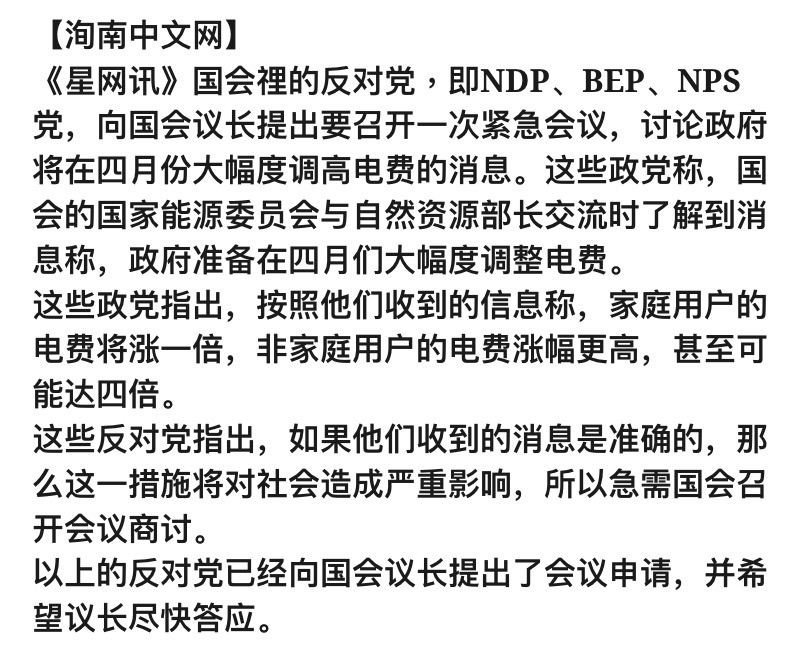 NDP、BEP、NPS称收到消息四月份将大幅提升电费
