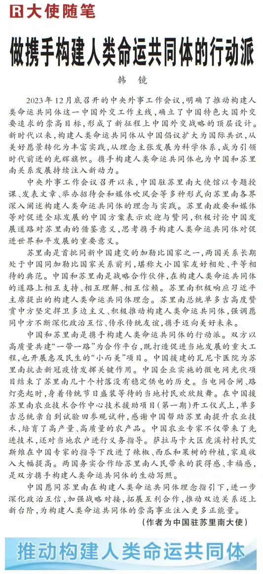 2024年4月2日,《人民日报》大使随笔专栏刊登了韩镜大使的署名文章《做携手构建人类命运共同体的行动派》。全文如下:2023年12月底召开的中央外事工作会议,明确了推动构建人类命运共同体这一中国外交工作主线,确立了中国特色大国外交要追求的崇高目标,形成了新征程上中国外交战略的顶层设计。新时代以来,构建人类命运共同体从中国倡议扩大为国际共识,从美好愿景转化为丰富实践,从理念主张发展为科学体系,成为引领时代前进的光辉旗帜。携手构建人类命运共同体也为中国和苏里南关系发展持续注入新动力。中央外事工作会议召开以来,中国驻苏里南大使馆以专题授课、发表文章、举办招待会和媒体吹风会等多种形式向苏里南各界深入阐述构建人类命运共同体的理念与实践。苏里南政要和媒体等对促进全球发展的中国方案表示欢迎与赞同,积极讨论中国发展道路对苏里南的借鉴意义,思考携手构建人类命运共同体对促进世界和平发展的重要意义。苏里南是首批同新中国建交的加勒比国家之一,两国关系长期处于中国同加勒比国家关系前列,堪称大小国家友好相处、平等相待的典范。中国和苏里南是战略合作伙伴,在构建人类命运共同体的道路上相互支持、相互理解、相互信赖。苏里南积极响应习近平主席提出的构建人类命运共同体理念。苏里南总统单多吉高度赞赏中方坚定捍卫多边主义、积极推动构建人类命运共同体,强调愿同中方不断深化政治互信、传承传统友谊,携手迈向美好未来。中国和苏里南是携手构建人类命运共同体的行动派。双方以高质量共建“一带一路”为合作平台,既打造促进当地发展的重大工程,也开展惠及民生的“小而美”项目。中国援建的瓦尼卡医院为苏里南抗击新冠疫情发挥关键作用。中国企业实施的微电网光伏项目结束了苏里南几十个村落没有稳定供电的历史。当电网合闸、路灯亮起时,身着传统节日盛装等待的当地村民欢欣鼓舞。在中国援苏里南农业技术合作中心技术援助项目(第一期)开工仪式上,单多吉总统亲自到试验田参观试种,感谢中国帮助苏里南提升农业技术,培育了高产量、高质量的农产品。中国农业专家不仅带来了先进技术,还对当地农户进行义务指导。萨拉马卡大区虎溪村村民艾斯维在中国专家的指导下改进了辣椒、西瓜和果树的种植,家庭收入大幅提高。两国务实合作给苏里南人民带来的获得感、幸福感,是双方携手构建人类命运共同体的生动写照。中国愿同苏里南在构建人类命运共同体理念指引下,进一步深化政治互信,加强战略对接,拓展互利合作,推动双边关系迈上新台阶,为构建人类命运共同体的崇高事业注入更多正能量。