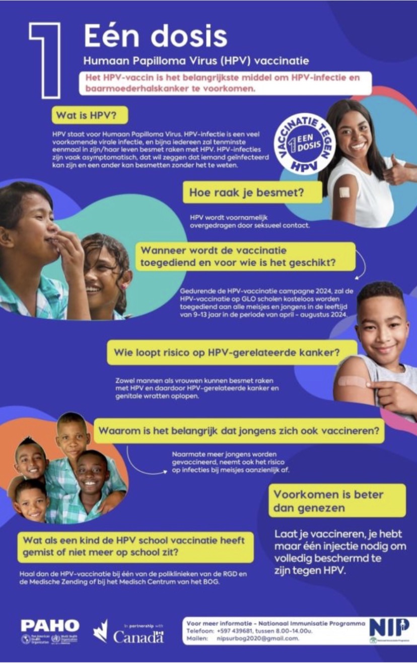 卫生部公共卫生局的国家免疫计划(NIP)已重新启动了全国HPV学校疫苗接种工作,以确保更多的女孩以及男孩免受HPV相关疾病(包括癌症)的影响。儿童接种HPV疫苗产生的免疫力更强,可以持续数十年。因此,苏里南卫生部对9至13岁的女生和男生接种HPV疫苗。