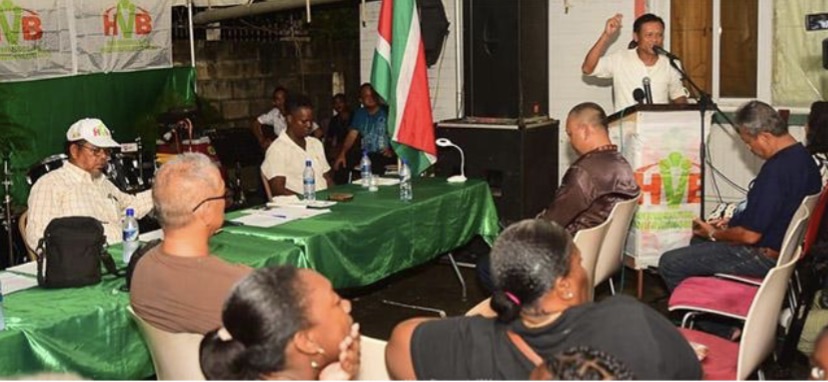 党主席Mike Noersalim(前任内政部长)回顾了自上次选举以来党的使命。他表示:“作为最大的议会外政党,我们在过去两年中努力为苏里南选民提供另一种选择。我们与所有政党和中间派进步势力进行了对话,希望组建一个紧密的联盟。遗憾的是,目前还没有达成共识,但HVB必须继续前进!”