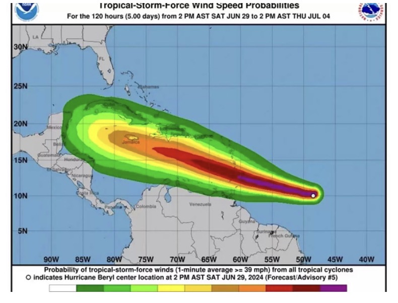 对于MDS来说,很明显还只是热带风暴的Beryl影响主要体现在降雨量增加、雷暴强度和风速上。这些因素也已纳入2024年6月29日(星期六)和6月30日(星期天)的天气预报中(未具体提及热带风暴Beryl)。