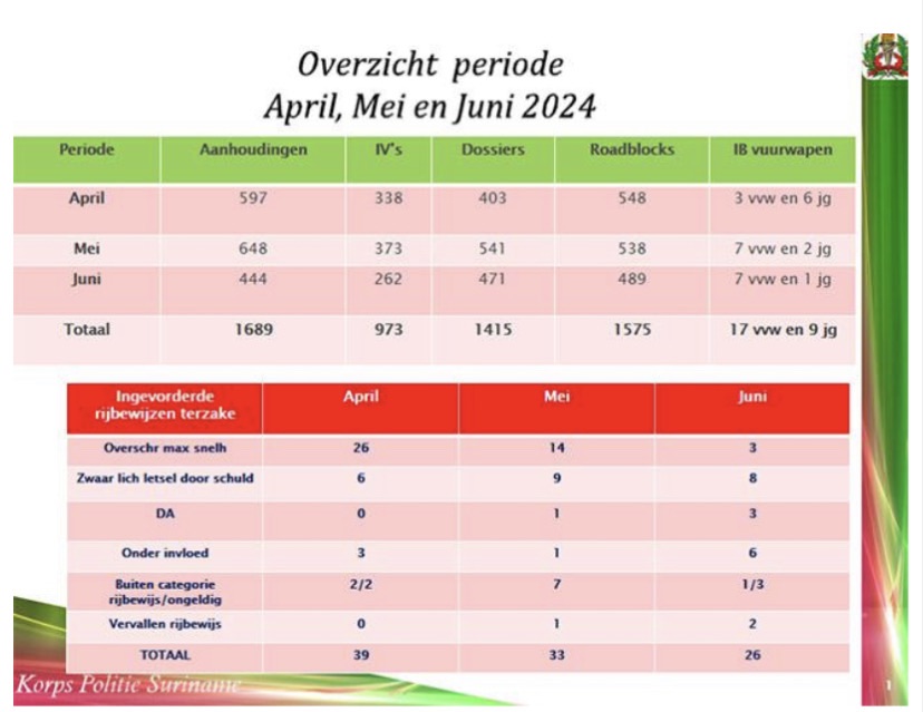 根据苏里南警察局的全国数据显示,2024年第二季度,共逮捕了1,689名嫌疑人,其中58%以上,也就是973人被拘留。这些嫌疑人涉及抢劫、袭击和其他暴力犯罪。总共向检察院提交了1,415份案件。