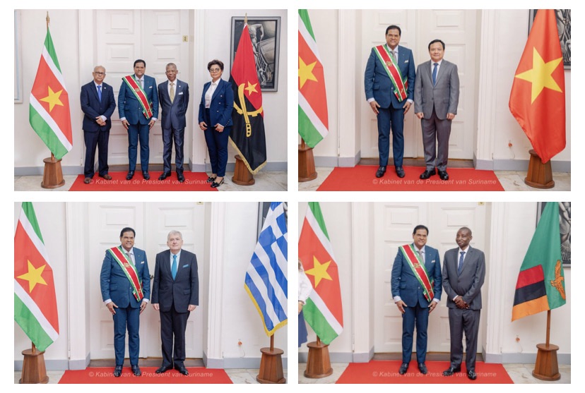 Santokhi 总统亲自欢迎了这些使节,并强调了苏里南平衡和包容的外交政策的重要性。总统表示:“这些大使的任命无疑将促进我们与这些国家之间的外交和双边关系。”他指出,苏里南致力于与其他国家建立紧密、友好和动态的合作关系。Santokhi 总统表示,苏里南正在发展其国家经济,同时追求专业和负责任的外交政策。