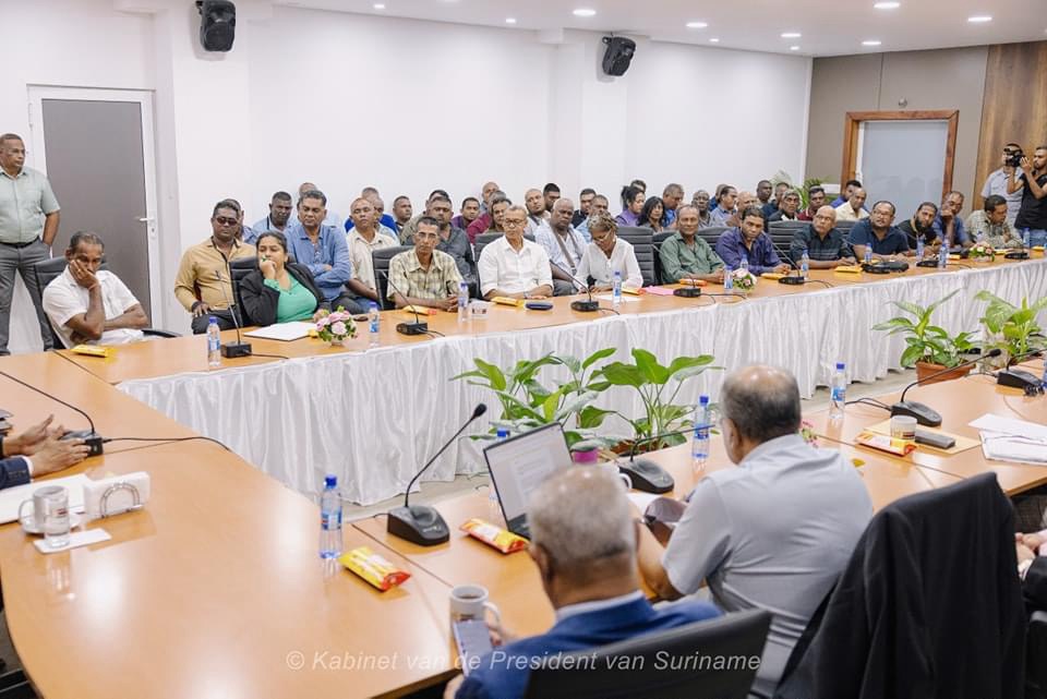 2024年8月5日,星期一,总统Santokhi接见了来自Nickerie区的稻农,并提出了迅速支付补偿金的解决方案。总统向在场的农民保证:“大家要明确一点:我们站在农民的一边,我们有共同的目标。政府不会亏待你们;通过对话和协商,我们将共同找到可行的解决方案。”