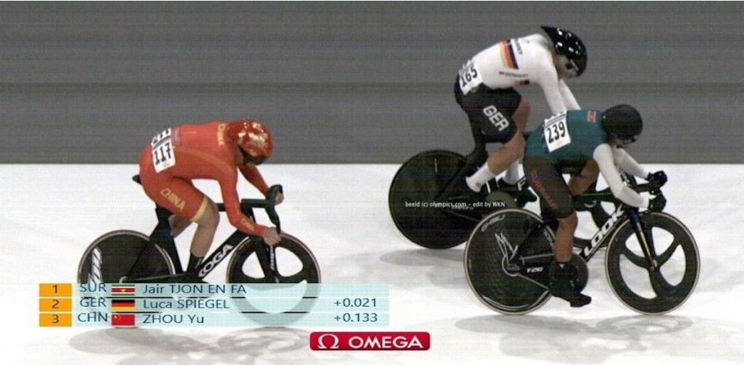 苏里南场地自行车运动员Jaïr Tjon En Fa,代表苏里南参加在巴黎举行的奥运会,于8月7日下午(当地时间)在复活赛中获得小组第一,从而晋级下一轮比赛,即1/16决赛。当地时间17:30,他将对阵以色列选手Yakovlev Mikhail。