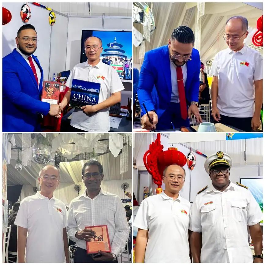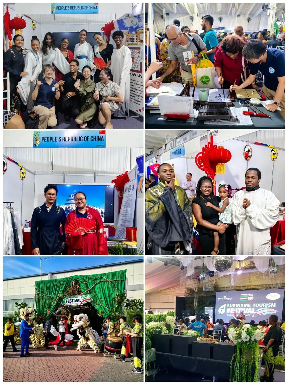 中国展台前访客络绎不绝,欢声笑语不断。苏里南中华会馆醒狮团舞狮迎宾,苏大孔院陈爱锋院长及当地教师和志愿者同访客交流互动。各界民众驻足观看介绍中国高质量发展成就和丰富旅游资源的宣传片,饶有兴致地体验书画、服饰、游艺等中华传统文化项目,热情分享其此前赴华经历和对中国向往,纷纷表示希有机会赴华旅游参访,亲身感受中国秀美风光和灿烂文化。