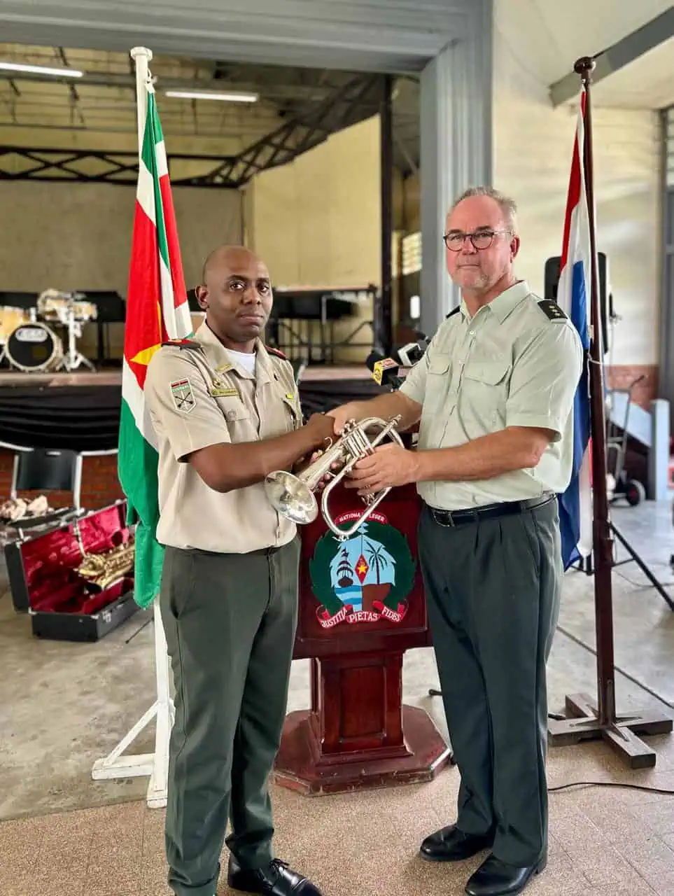 《政府网讯》11月19日,苏里南军乐团(MKS)从荷兰接收了一批总价值约1.8万欧元的乐器。这批乐器包括鼓组、定音鼓、钟琴和军号等,由荷兰军方代表、上尉Jody van Overbeek转交给苏里南军乐团代表少校Brian Landveld。