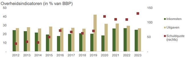 SEOB指出,历史数据表明,苏里南政府长期存在财政失衡的问题。2012年至2023年期间,政府支出占GDP的比重持续高于收入,导致财政赤字扩大,迫使国家依赖增加债务弥补差额(见图表)。